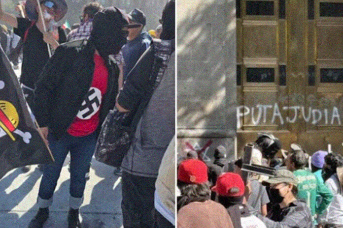 Pero hay algo que no cuadra: el hombre que sostiene la bandera tiene 80 años, apenas pertenece a la Generación Z. Otra bandera la sostiene un hombre encapuchado que lleva una enorme esvástica. Las palabras «puta judía», dirigidas a la presidenta Claudia Sheinbaum, están pintadas con spray en el Palacio Nacional. Vicente Fox, el reaccionario expresidente de México, está a tu lado con un mal disfraz y una camiseta de One Piece. Casi no se ve a ningún joven en varias cuadras.