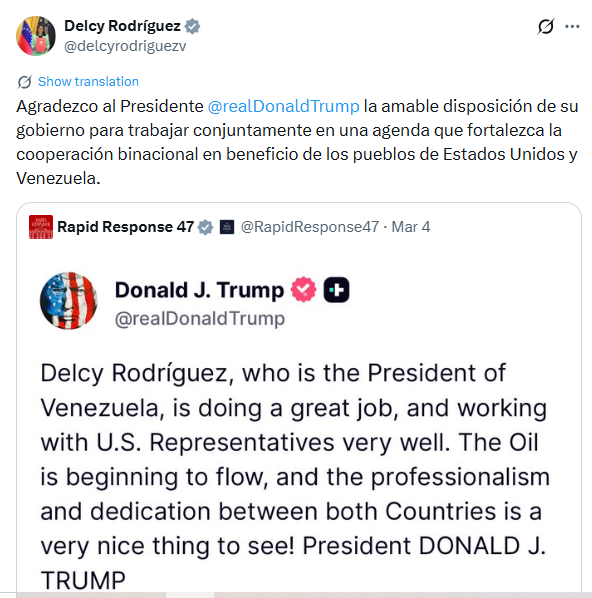 Ese mismo día, el presidente Trump había hecho una publicación elogiosa en redes sociales: «Delcy Rodríguez, presidenta de Venezuela, está haciendo un excelente trabajo y colaborando muy bien con los representantes estadounidenses. El petróleo está empezando a fluir, y el profesionalismo y la dedicación entre ambos países es algo muy grato de ver.»